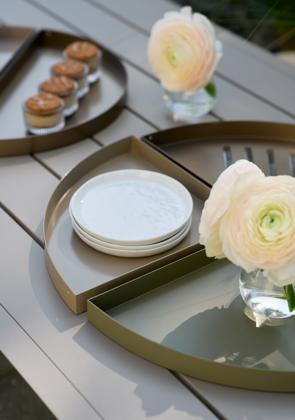 A sculptural five-piece circular tray set, featuring one grand tray divided into three refined sections and two smaller circular pieces. Offered in two curated palettes: