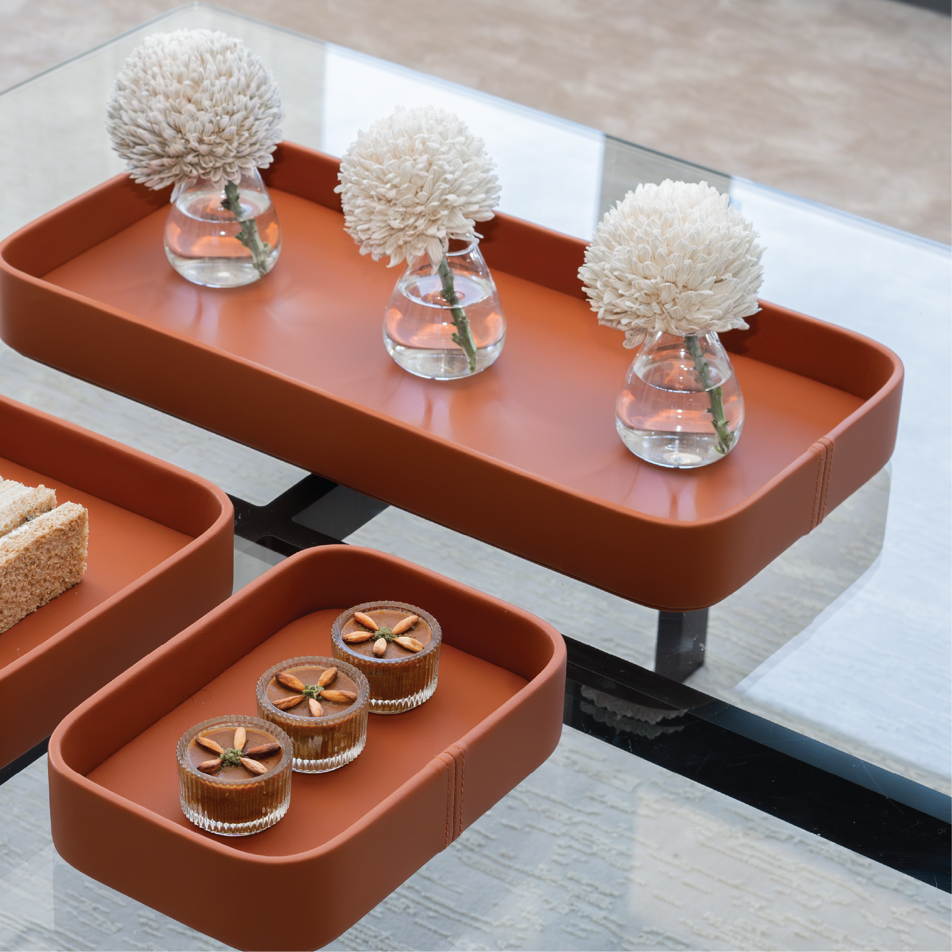 Crafted from premium leather, the Shibui Tray Set brings a touch of sophistication to your table. Perfect for tea, coffee, or dessert setups, these versatile trays are available in three elegant colors—Concrete, Hint of vanilla, and Burnt amber. The set includes three sizes:
